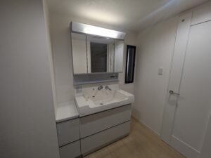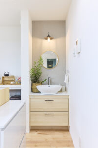 洗面所はあえて扉を設けず、空間を広く使えるようLDKに造作洗面を作りました。