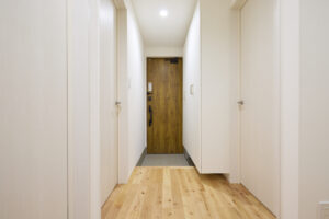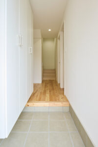 2階世帯はまっすぐ2階へ上がれます。玄関収納はフルハイドアで、たっぷりと大容量で2世帯分でも安心です。